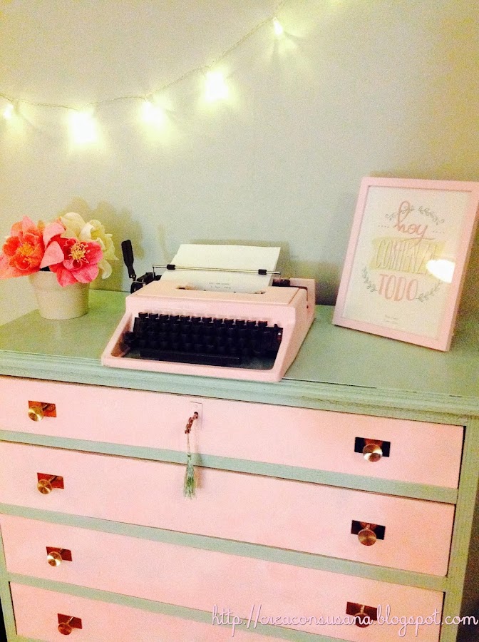 La cómoda la pinté utilizando dos pinturas diferentes, por un lado, usé la pintura de tiza de la marca Plascolor del color “jade” y por otro lado, la pintura en spray de la marca Pinty Plus del tono “rosa empolvado”. Con esta última, también pinté la máquina de escribir.