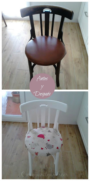 Parece mentira, pero es su primer trabajo de bricolaje, que ha desempeñado bajo nuestros consejos de bricoadictos. Cómo veis en la foto, os mostramos el antes y el después. No cabe duda, que con una buena mano de pintura decorativa y buen tapizado low cost, podemos estrenar nuevas sillas.