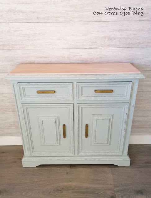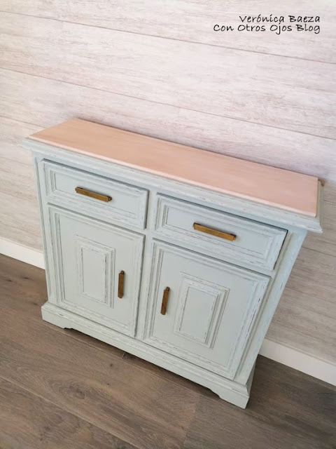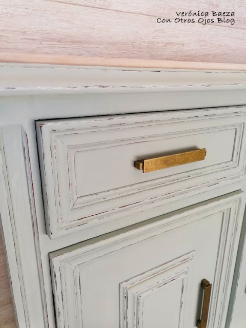 Sin lijado previo le apliqué dos manos de pintura la tiza de color blanco, a continuación le di otra de un color gris verdoso. Una vez seca la pintura desgasté algunas zonas con una lija de grano fino, sobre todo en esquinas y molduras. Con una brocha seca retiré todo el polvillo que se había producido al lijar y finalmente para proteger el mueble le apliqué un barniz incoloro ultra mate.