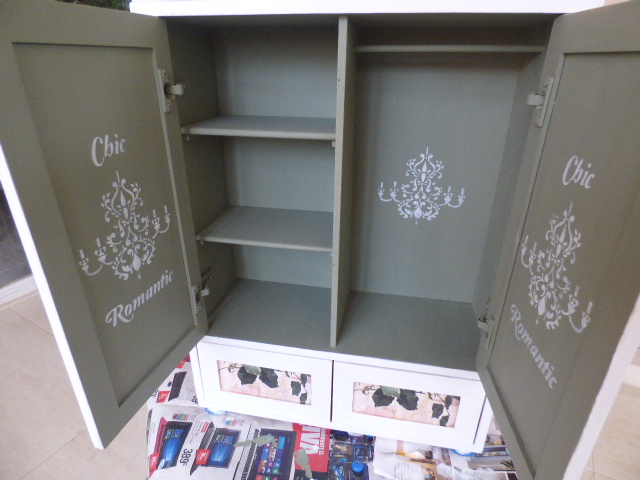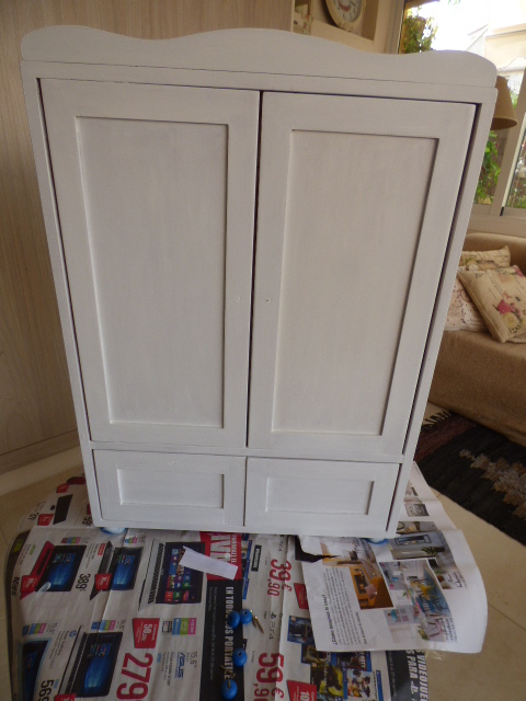 Una vez ya decorado y hechos los estarcidos le dí cera blanca a todo y a la vez un poquito de cera oscura. Lo justo para que la madera perdiera ese color blanco rabioso.