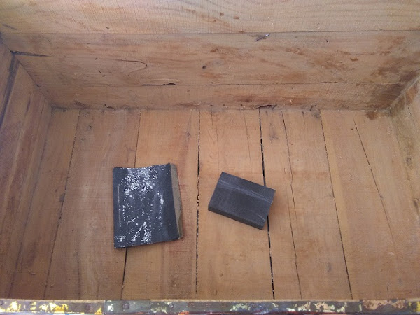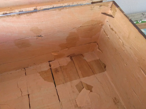 Es obvio decir que lo primero que tuve que hacer, igual que en cualquier pieza, fue lavar a fondo todo el baúl con agua y sosa caústica. Últimamente he leído que la utilización de sosa es excesivamente agresiva para una pieza de madera antigua. Quizás en el caso de maderas talladas, o más blandas pueda resultar dañina, pero en los trabajos que yo hago, con maderas poco trabajadas, me va muy bien y nunca he destrozado nada.