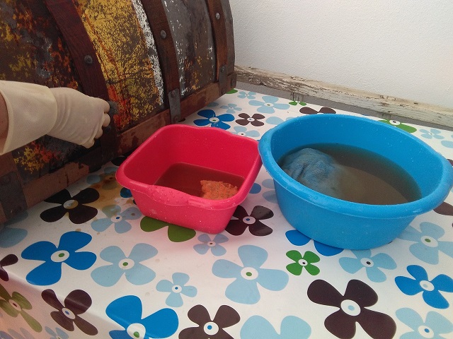 Para mi sorpresa, la pintura de las chapas salía al mismo tiempo que el tinte de las maderas, así es que no necesité otro detergente. Eso sí: el agua la tuve que renovar más de 50 veces, xD!!