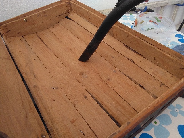 Al final, con un cepillito de cerdas metálicas, eliminé todos los restos de papel mojado y dejé secar completamente. Como vivo en Extremadura y tenemos unos veranos tan calurosos, con un día fue suficiente. Una buena lijada a todo el interior, para que la madera quedara suave y, con la aspiradora, eliminar todo el polvo que se genera.