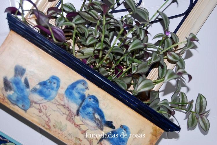 En estas imágenes colgado en la cocina con fondo blanco, resulta muy decorativo, con el colorido y viveza de esta bonita planta Trandescantia Zebrina