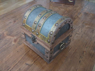 Las tiras metálicas de la tapa son de pvc tintado, imitando el latón oxidado. Para conseguir este efecto hemos aplicado una serie de capas de pintura martelé dorado, tinte y barniz de poliuretano, acabando el proceso con acrílico dorado y barniz al agua. Es una pequeña invención nuestra.