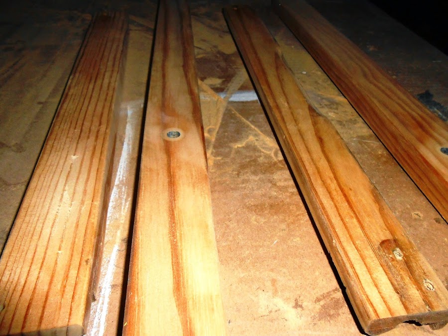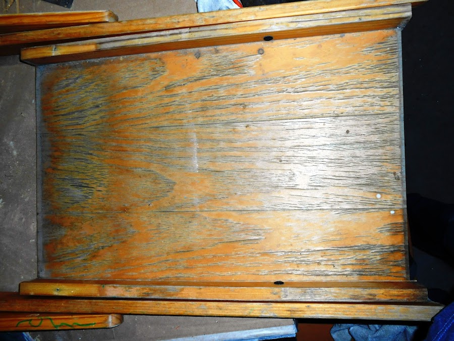 A continuación podemos ver el estado en el que se encontraba la citada camarera, aparte de faltar partes de la madera, las que quedaban estaban sujetas con una decena de tornillos y tuercas que hacían de parches para mantenerla unida y en pie, tras un par de años en la intemperie todo el barniz estaba levantado y la mayoría de piezas encorvadas por la humedad.