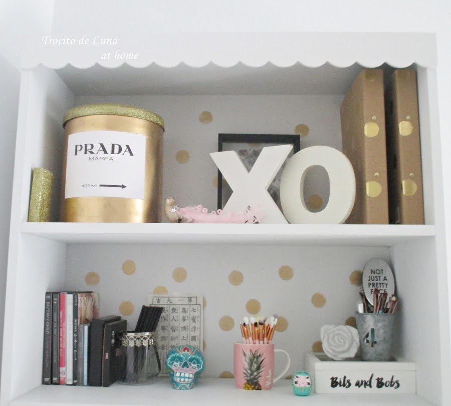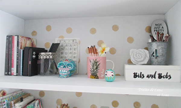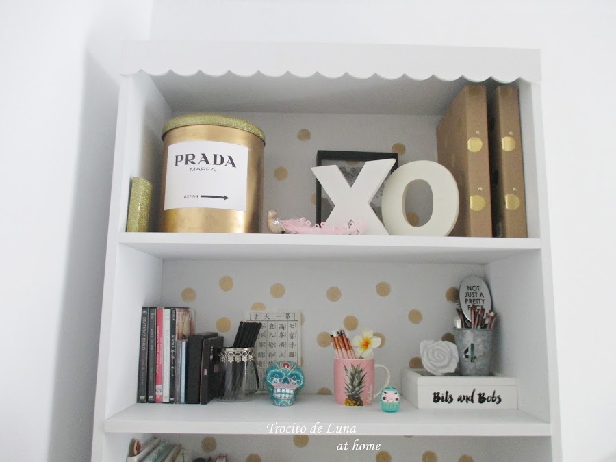 El fondo de los estantes lo estampamos a libre albedrío con círculos hechos con la parte lateral, la redondita de un rodillo que mojábamos en pintura dorada de mucho en mucho.
