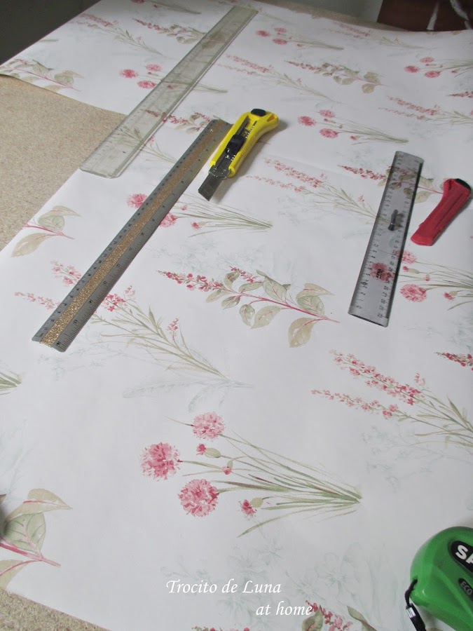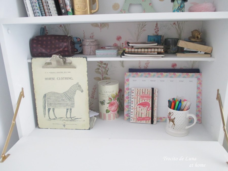 Para el fondo interior del escritorio encontré un papel (de pared) precioooso del cual, después de preguntar el precio del rollo y ver la cara que me quedó, y dado que no iba a necesitar mucho, me regalaron un buen trozo del de muestra en la tienda, qué majos!!