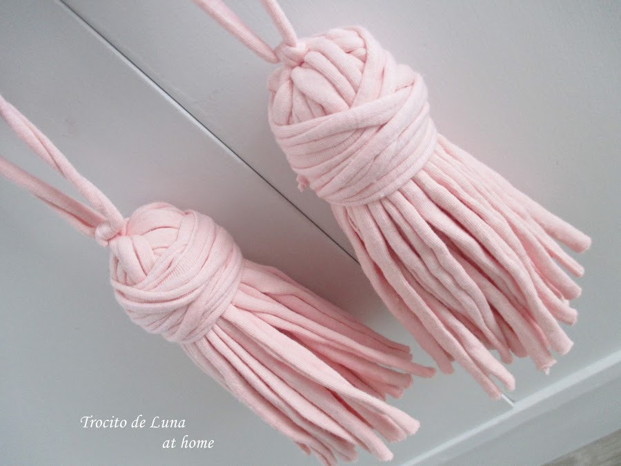 En los pomos, unas borlas que hice con trapillo, bien gorditas y en un rosa muy pálido.