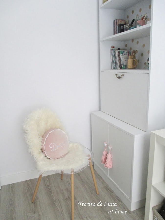 En esa pared que se ve al lado del escritorio va colocado un espejo que aún no hemos encontrado, uno de cuerpo entero donde pueda visionar a la perfección sus outfits, ya que la habitación es alargada y hay espacio para verse bien enterita ;)