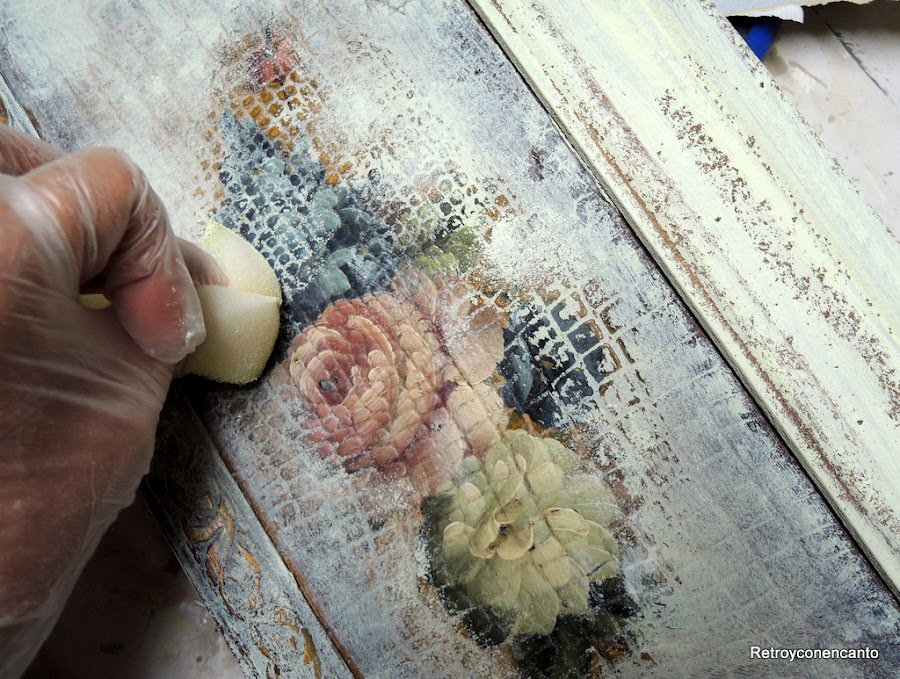 Para continuar con la parte decorada, con la que comenzó el lío... Empezamos pintando con el pincel muy seco...-"¡Qué feo, limpia, limpia!" (menos mal que siempre tenemos un paño mojado encima de la mesa para imprevistos). Seguimos con el rodillo... "¡Queda peor, quita, quita!". Al final recurrimos a una esponja y, a pequeños toquecitos, fuimos cubriendo toda la superficie...
