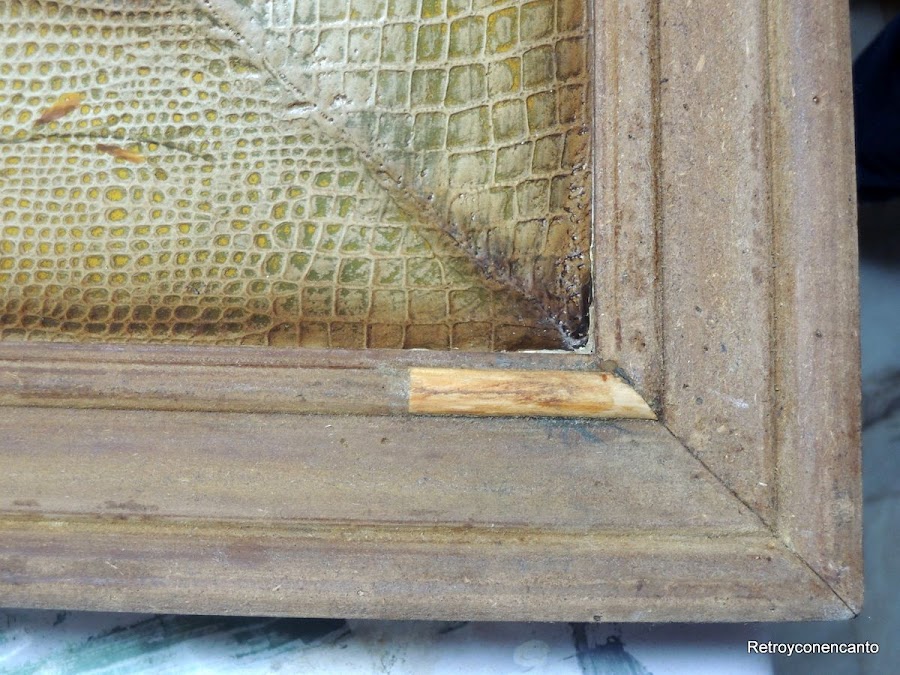 Sobre la mesa de trabajo, estudiamos más detenidamente la moldura para tratar de averiguar su composición, pues no es madera, como a primera vista pueda parecer. Mas bien parece corcho o papel prensado, al menos esa es la conclusión a la que llegamos. El dibujo del centro sí tenemos claro que es un decoupage.