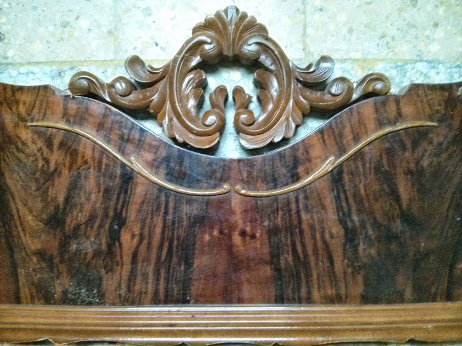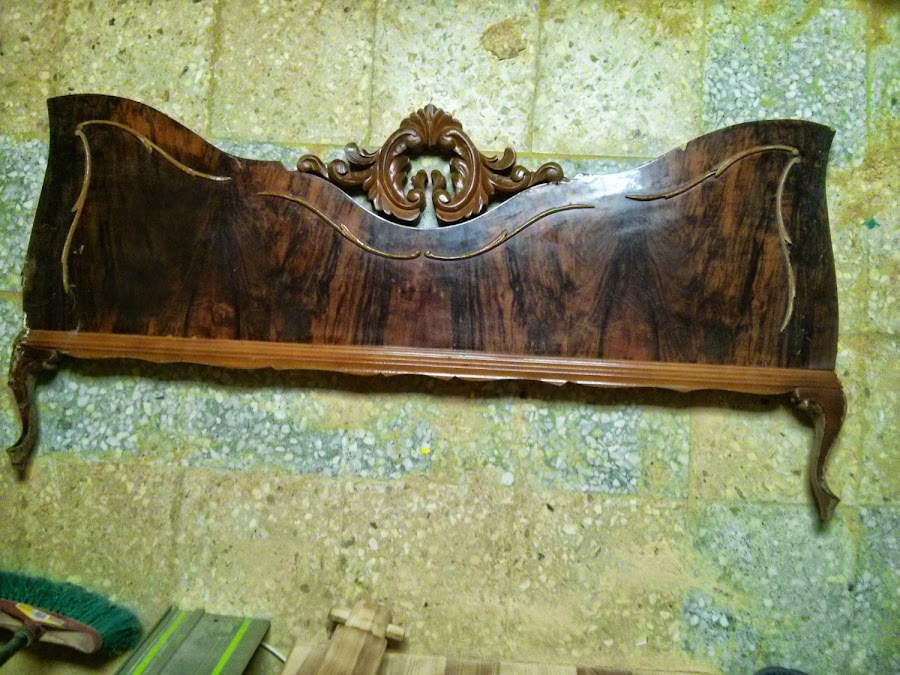 El pie de cama estaba desemparejado y bastante roto. La parte de abajo era simple melamina así que la única parte que se podía aprovechar era la pieza de madera que lo coronaba.