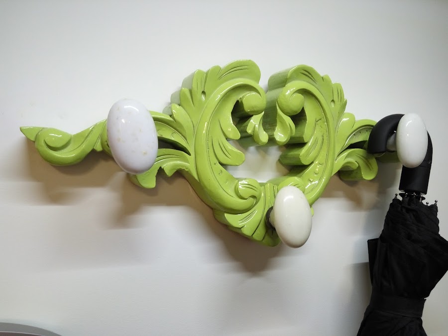 Así que le dimos una mano de pintura a la pieza de madera, unimos los pomos a ella mediante unos tornillos y una cola de dos componentes y lo colgamos de la pared. ¿Qué os parece el resultado?