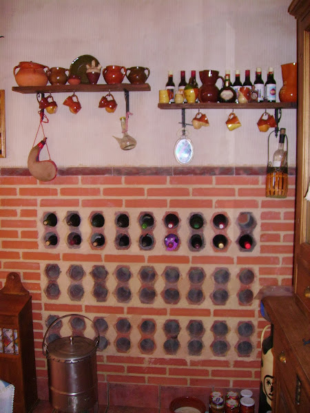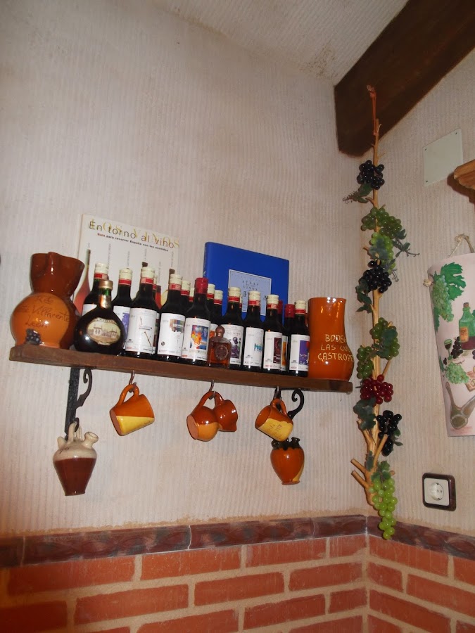 Por último las puse sobre unos soportes de forja atornillados a la pared, coloqué las botellas, jarras y vasijas y como elemento decorativo colgué sobre las vigas y al lado de las baldas, una vid con unas uvas de decoración (de plástico)