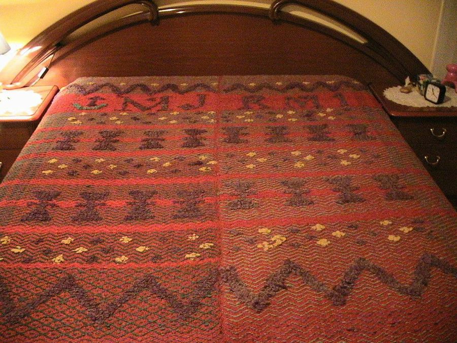 Monielfa nos presenta la colcha que su bisabuela hizo en un telar hace 115 años. La artista le puso sus iniciales, MJ RM. El fondo es rojo y tiene dibujos en amarillo, verde y malva. "Es mi tesoro”, dice Monielfa con enorme orgullo.