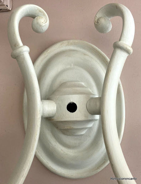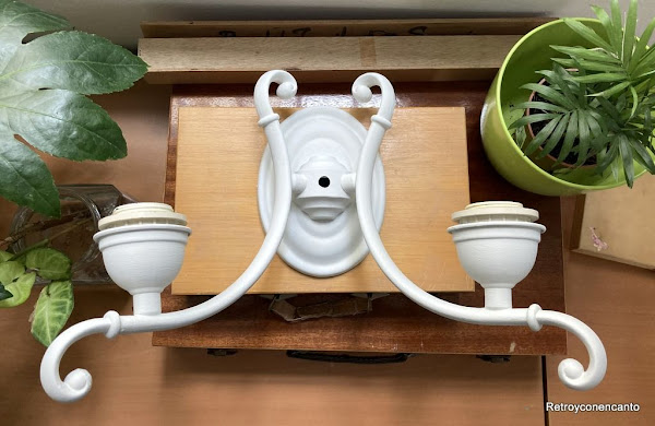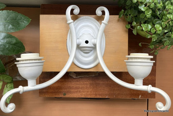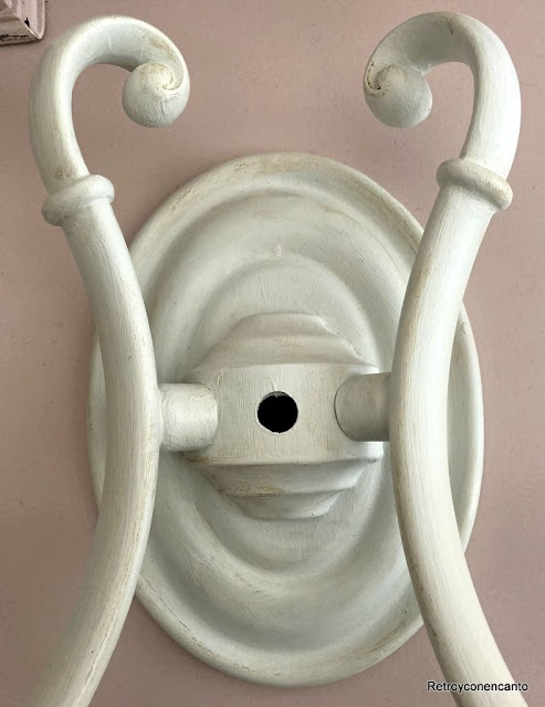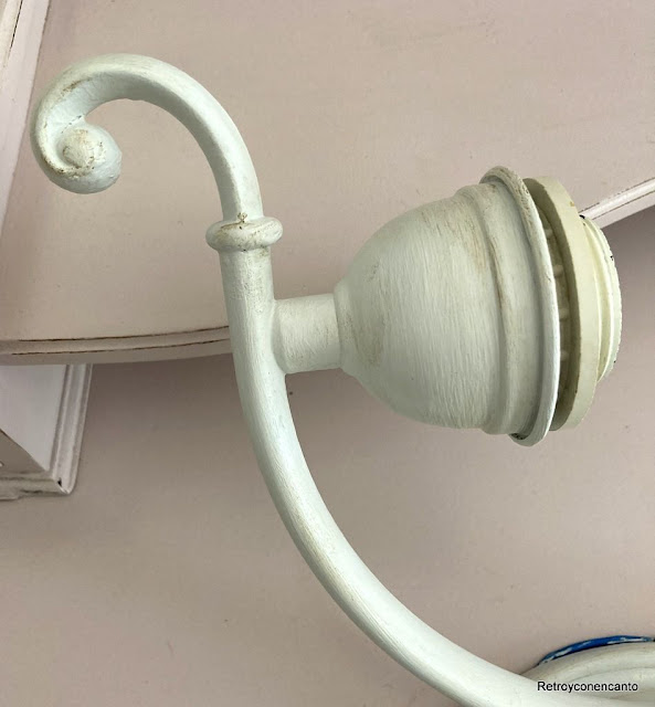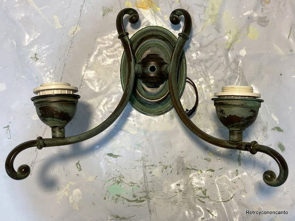 Por último, dejamos secar y lustramos con otro paño de algodón. En esta ultima foto no se aprecia demasiado la terminación, pues había demasiada luz... Y cuando editamos las fotos, el aplique ya no estaba con nosotras... Nos han prometido foto con las tulipas, y ya colocado en su pared...