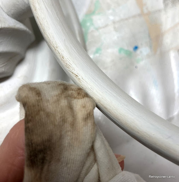 Para envejecer, primero dimos una capa generosa de cera por todo el aplique y, a continuación, mezclamos en un cacharrito más cera, calentada previamente en el microondas, con betún de Judea. Esta mezcla, con un pañito de algodón, la fuimos aplicando por las zonas más molduradas o sobresalientes de la pieza en cuestión.