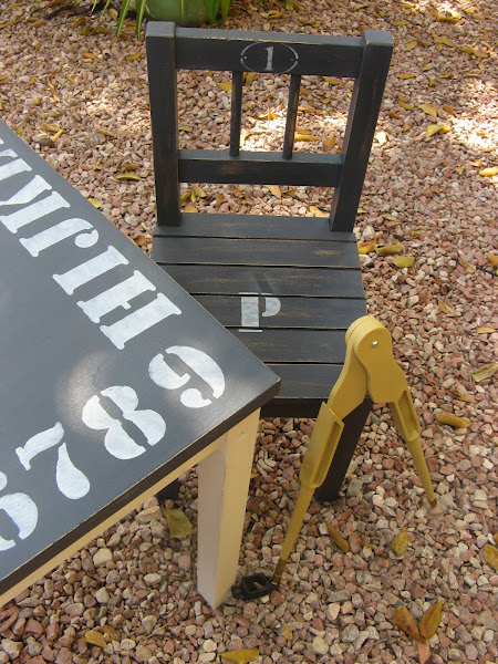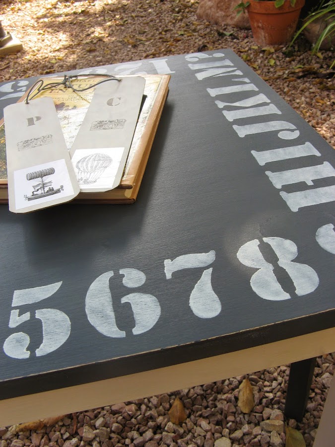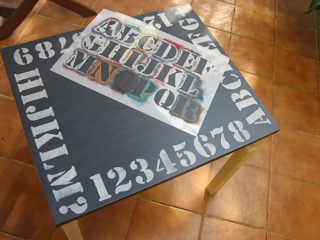 Después de estarcirlas todo alrededor del sobre de la mesa, las lijé suavemente y dí 4 capas de barniz acrilico a toda la parte superior de la mesa.....lijando suavemente, entre mano y mano.