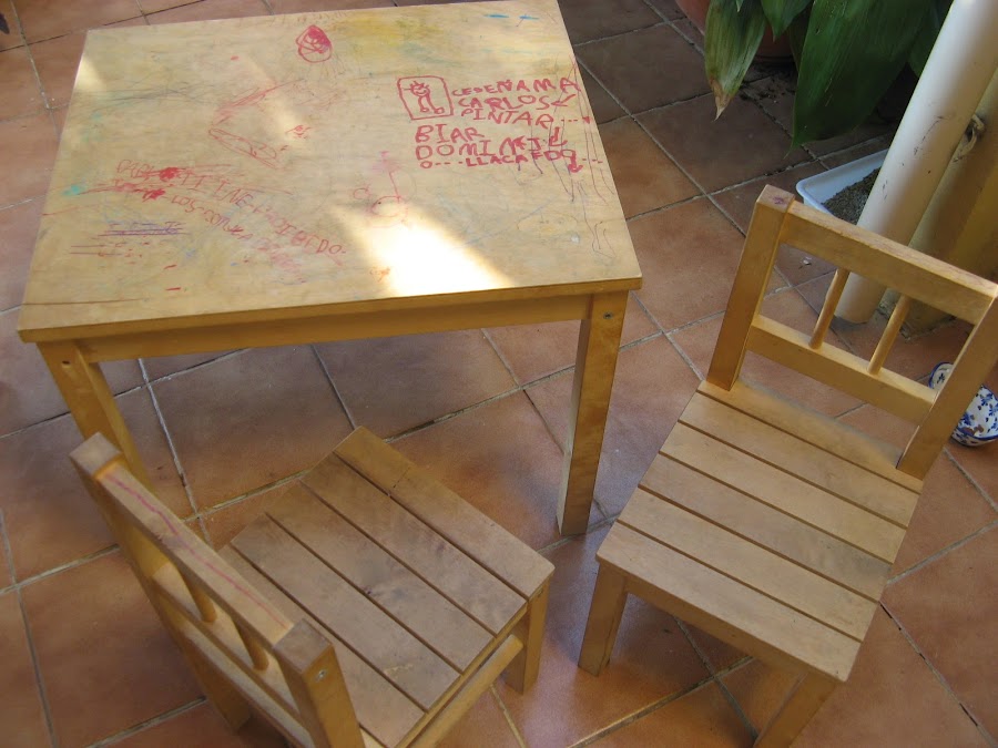 Esta semana pasada mi hermana Marta me dijo si podía darle un lavado de cara a este juego de mesa y sillitas de sus hijos. Lo compró en Ikea hace ya 4 o 5 años y lo han usado muchisimo mis sobrinos. Ahora la idea es ponerlo en un rincón de su salón para que lo utilicen para hacer los deberes y esas cosas.