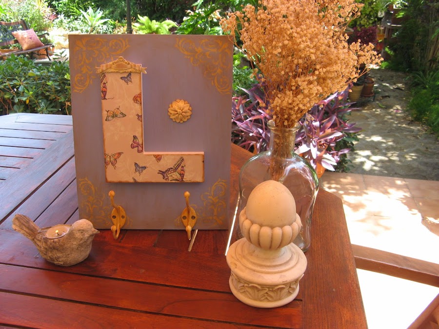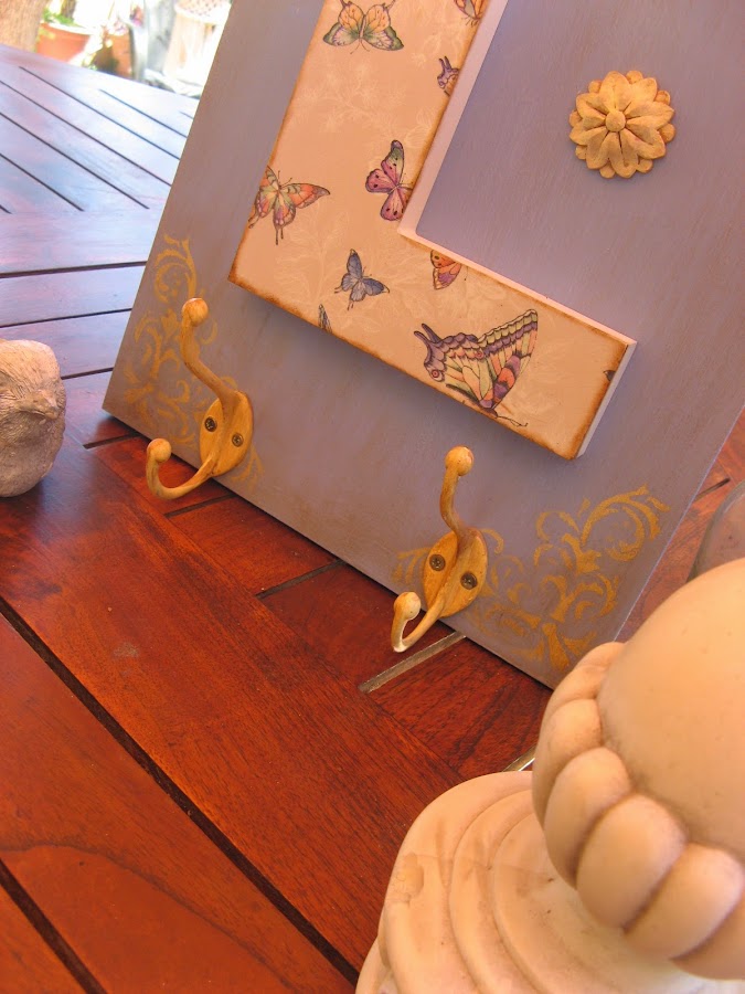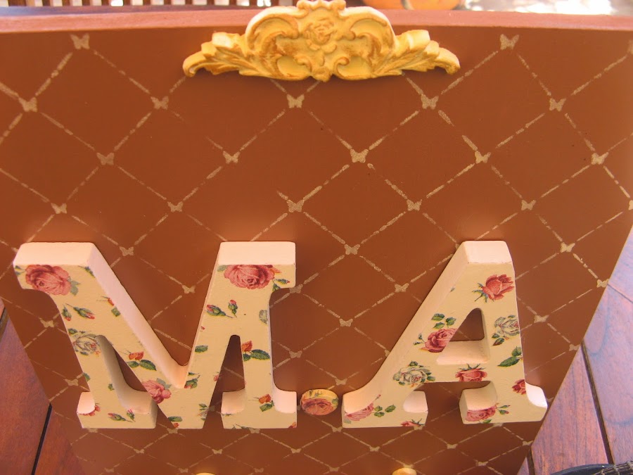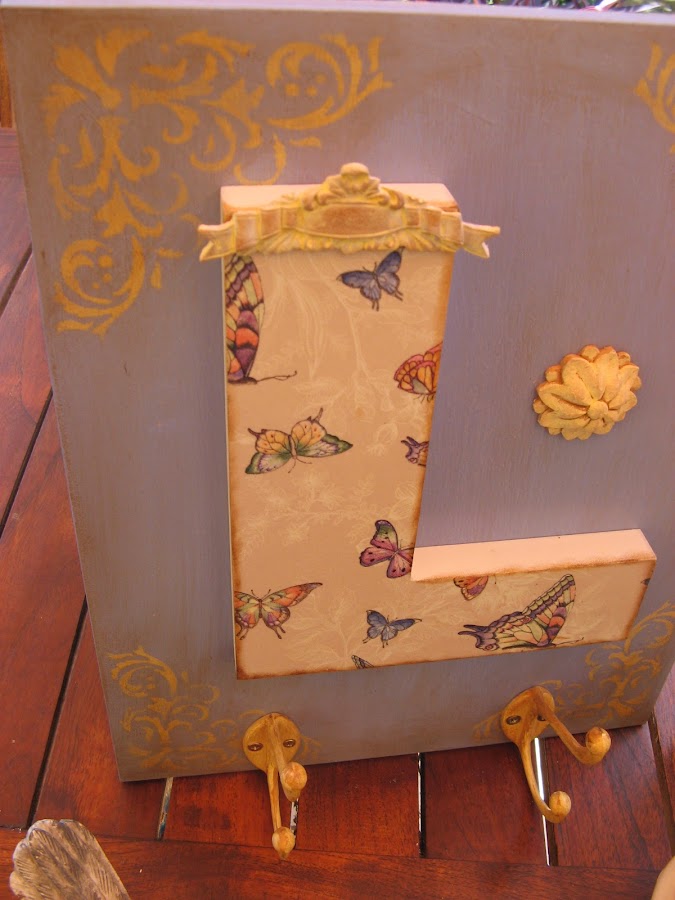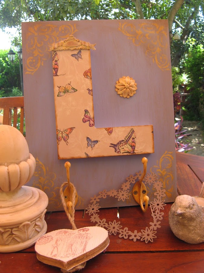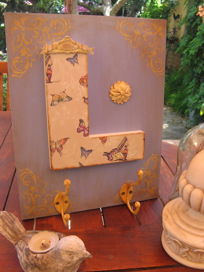 Consuelo quiso una perchita con el fondo azul y con la letra forrada con mariposas