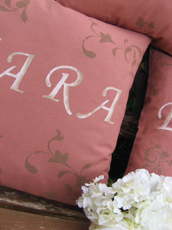 Elegimos una tela rosa palo muy bonita que estábamos deseando utilizar. ...y decidimos que lo que tenía que destacar eran los nombres, por lo que usamos pintura clarita para ellos y un tostado más subido para las flores del fondo.
