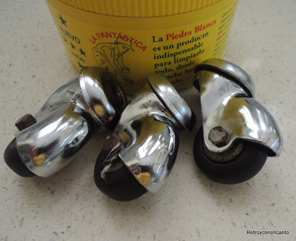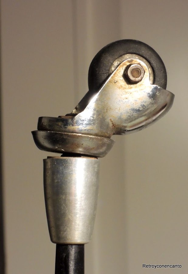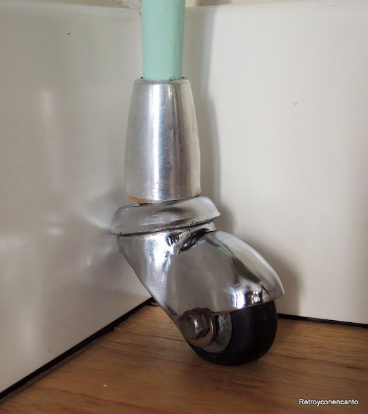 Las ruedas originales eran preciosas, así que decidimos que, si encontrábamos una nueva que encajara sin desentonar demasiado, las conservaríamos, en vez de cambiar las cuatro. Y tuvimos suerte, la novata, aunque ni por asomo tan bonita con las originales, cumple la misión de sustituir a la ausente, sin menoscabo del aire vintage de la mesa.