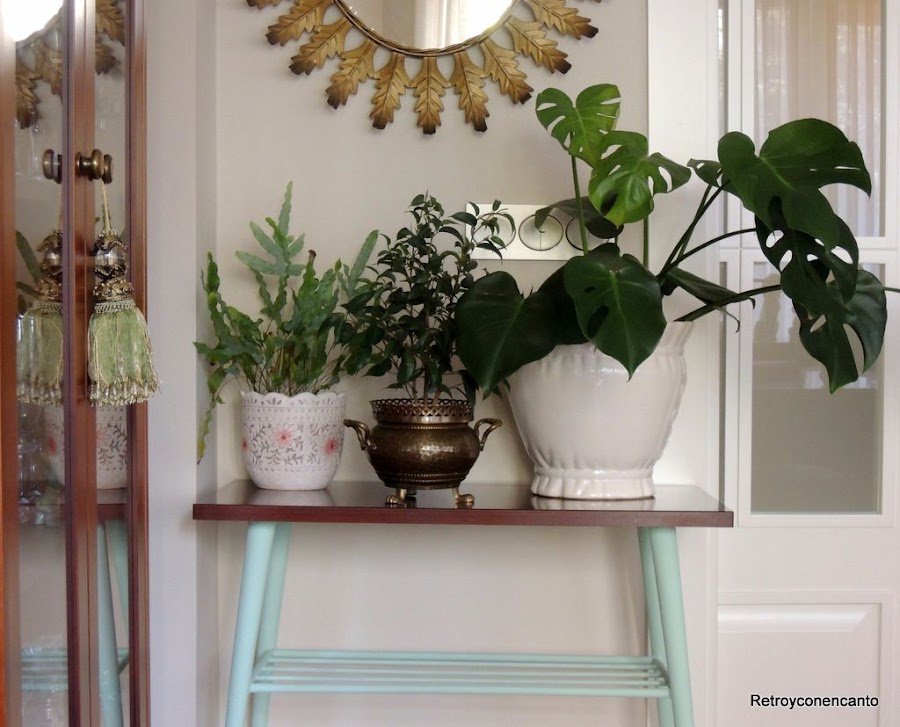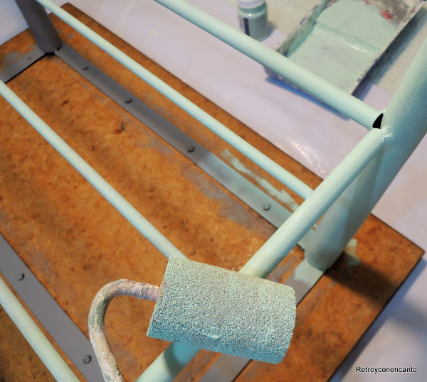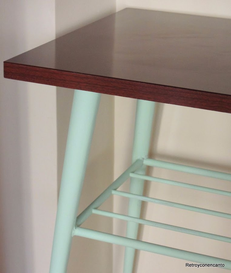 Teníamos claro cambiar el color negro de las patas; primero imprimamos en gris, para que la pintura sobre el hierro agarrara mejor, y luego pintamos en verde mint. En cuanto al sobre, no nos terminábamos de decidir a tunear la formica. Se encontraba en un magnífico estado y, además, la mesita iba destinada a una zona de trabajo donde tendría mucho, pero que mucho trote...