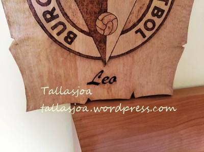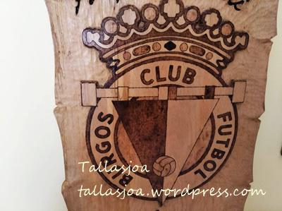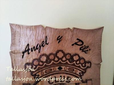 El borde de la tabla está tallado en forma de papiro con el escudo en la zona central , el cual está pirograbado sin estar esculpido, posteriormente se le ha aplicado cera natural de abeja como terminación y protección de la pieza.