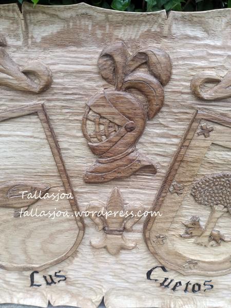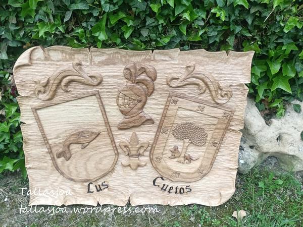 Están tallados en base de pergamino con adornos de lambrequines y yelmo en la parte central , en la parte de abajo como unión de los dos escudos ,una flor de lys