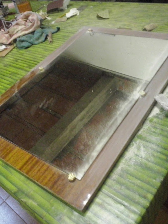 Retiramos el espejo, que en este caso ha salido perfectamente, pues no venía encolado, sino que simplemente estaba sujeto con estos clips doraditos