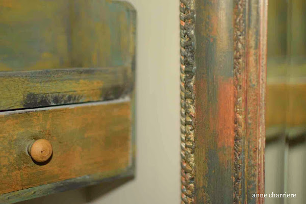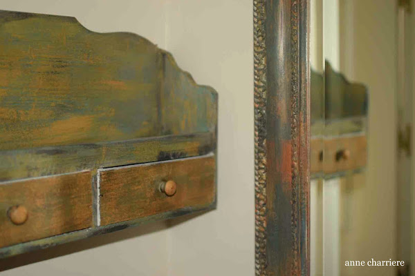 El espejo ya está puesto en el aseo de invitados, junto con un especiero que compré hace mucho tiempo y al cual apliqué el mismo proceso para obtener estos mismos tonos.