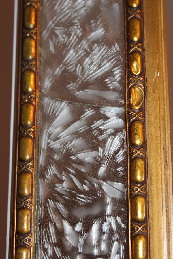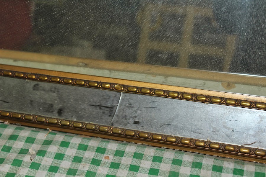 Primero le quité el color dorado que tenía en la parte de madera pero le dejé los embellecedores de latón. En el espejo del marco le puse una especie de craquelador de cristal en color blanco para que disimulase la raja