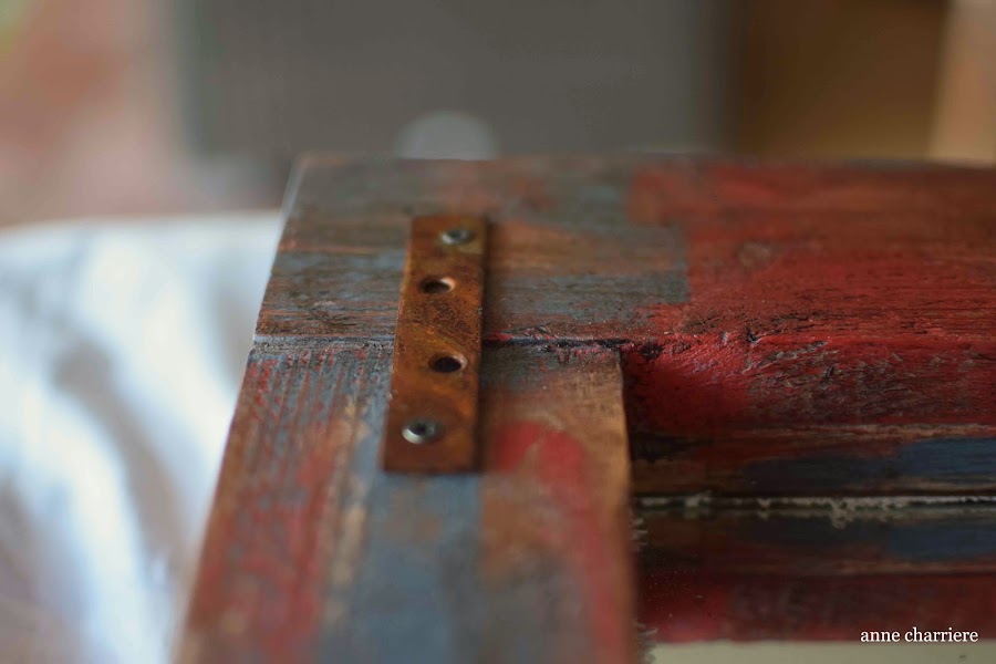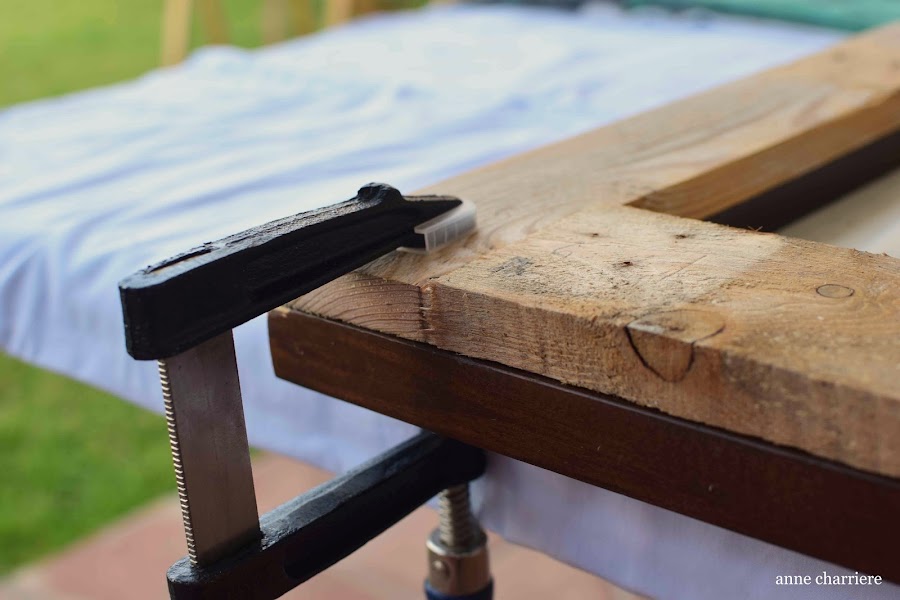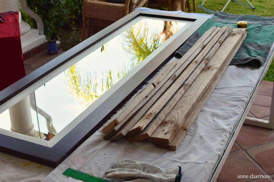 Pensé en pintarlo, claro, pero el marco era tan simple, con esquinas demasiados lineales... No transmitiría nada, incluso pintado, le faltaba mi toque personal! Así que me las ingenié para colocar unas tablas de palets encima, encolarlas e unirlas entre sí con unas pletinas envejecidas. Retiré las bisagras que sostenían el pie ya que al final, siempre había estado apoyado contra la pared y el pie no me servía.