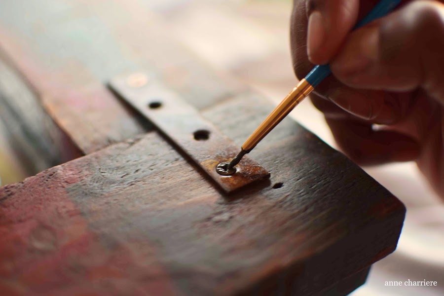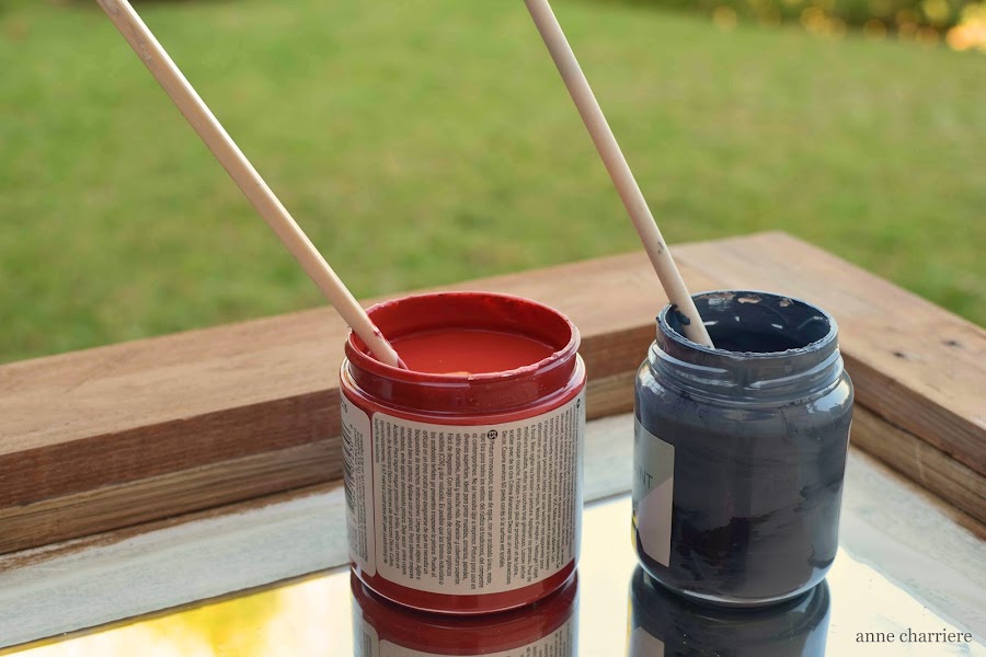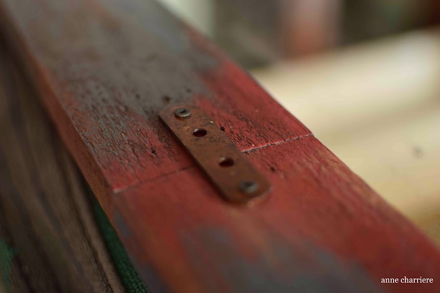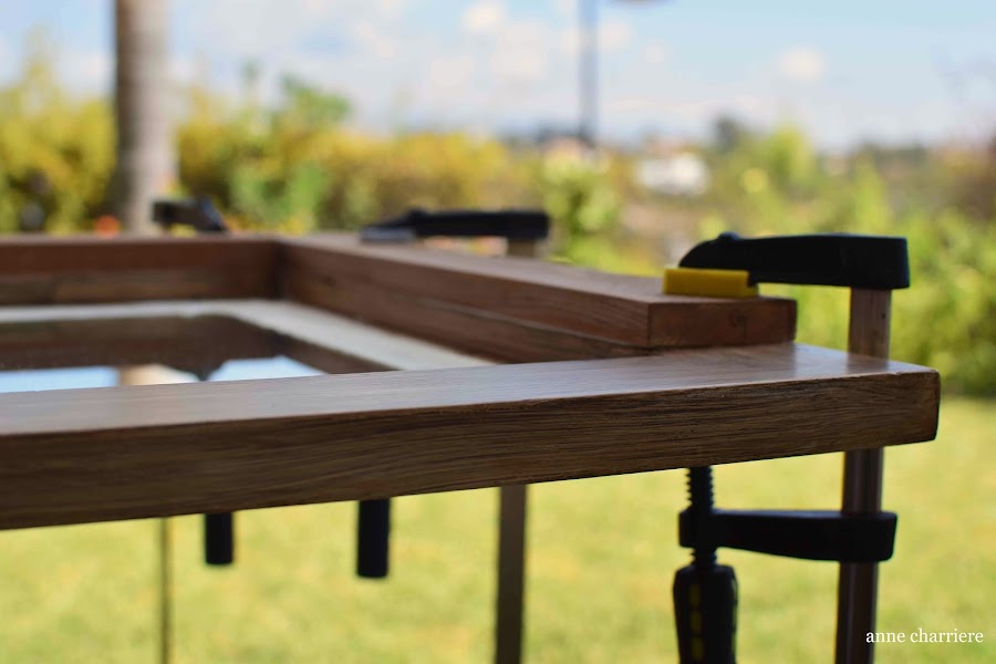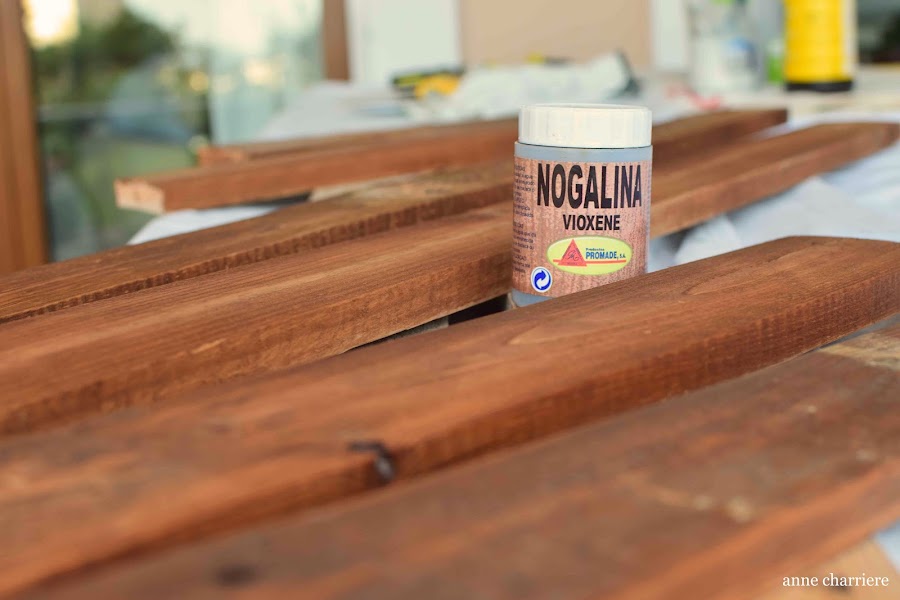 El marco no se iba a ver pero sí los bordes interiores así que le di una mano de imprimación y luego apliqué betún con un trapo (muy muy poco) para conseguir un tono madera clara. A las tablas, les di una capa de nogalina. No era realmente importante porque iba a pintarlas pero había que tener un color de fondo más o menos igualado.