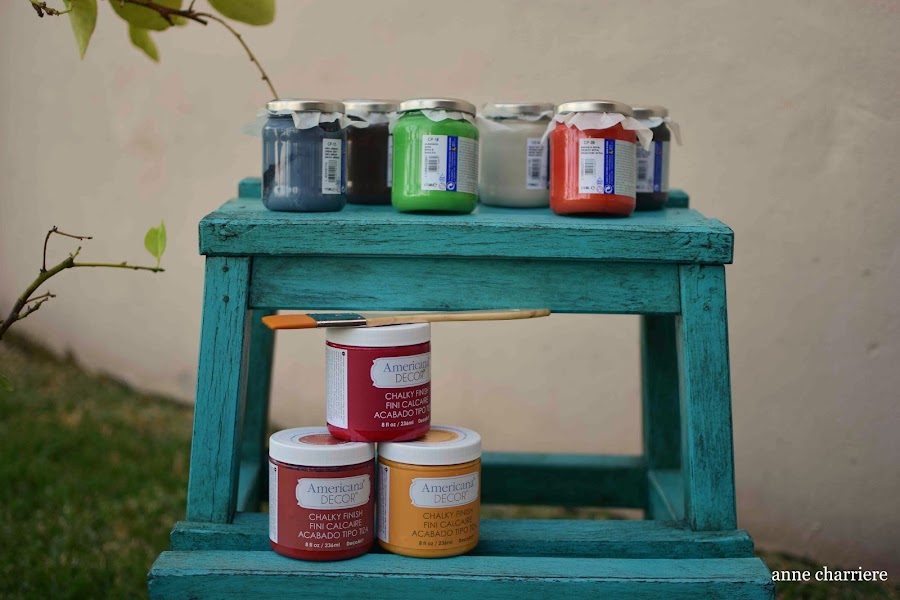 Para la pintura, ya sabéis que me gusta pintar con todas! Pero en este caso, quería conseguir una textura espesa por lo que utilicé un surtido de pintura de tiza: una de la Pajarita y la otra de la marca Americana Chalky. Aquí os dejo con el paso a paso; ya me diréis... Mientras tanto, me voy a pasar por los frugales de Marcela.