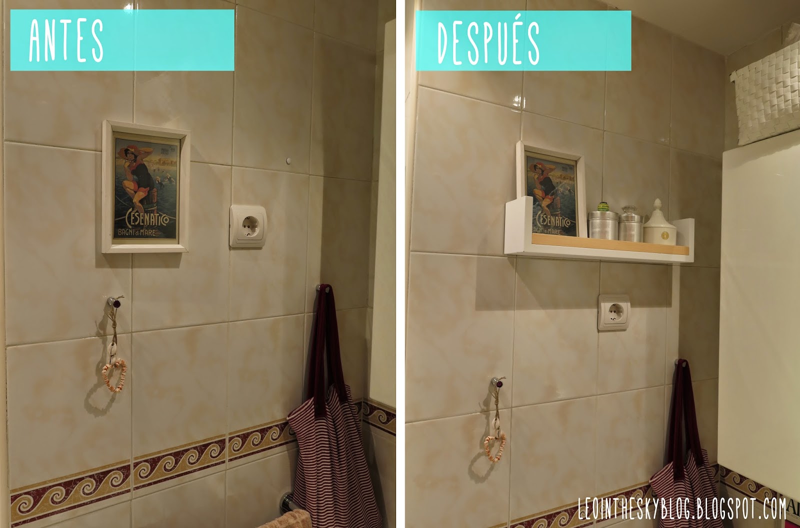 Al principio pensé en comprar una de esas baldas finitas que venden en la tienda sueca para poner cuadros, pero era demasiado grande y demasiado estrecha...¡no cabían bien mis botes! así que no tenía sentido comprarla..., entonces me acordé del estante este y pensé que podría tunearlo para darle un aire más bonito y ponerlo en el baño... Pues dicho y hecho este es el antes y el después de este rinconcito de mi baño: