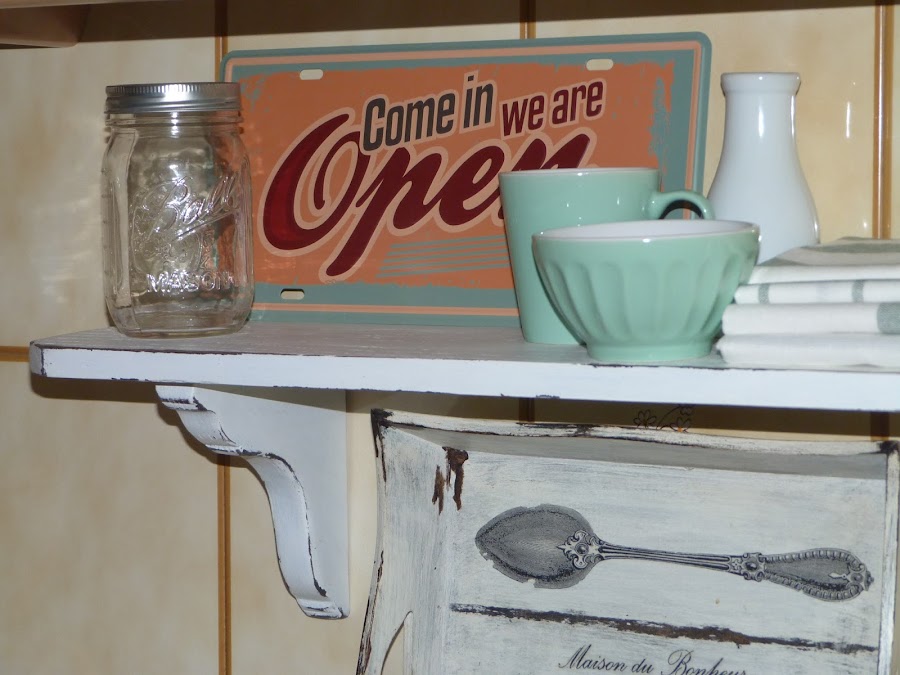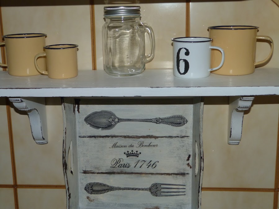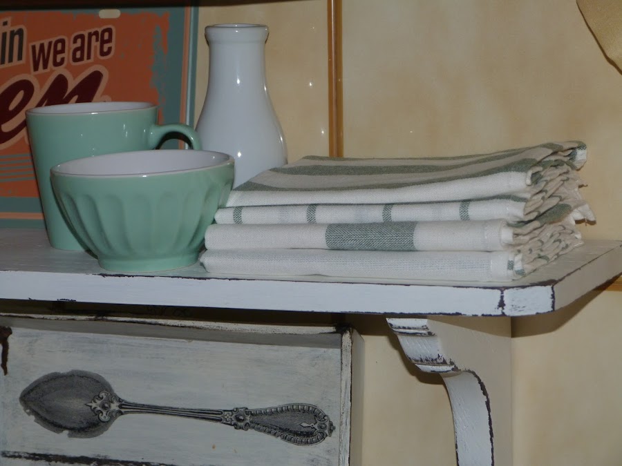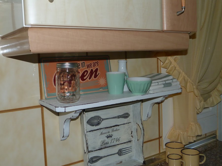 No sé... también hay un rincón debajo de la ventana, con la balanza verde y las aromáticas (podéis verlo pinchando aquí) y quizá no sería mala idea combinar esas tonalidades con las del estante.