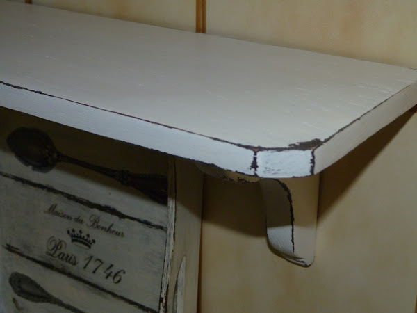 La idea era pintarla en color blanco y desgastarla muy ligeramente, apenas dejando entrever la madera oscura, así que dos manos de chalk paint blanco tiza, lija y dos manos de barniz. Así de sencillo ha sido este trabajo.