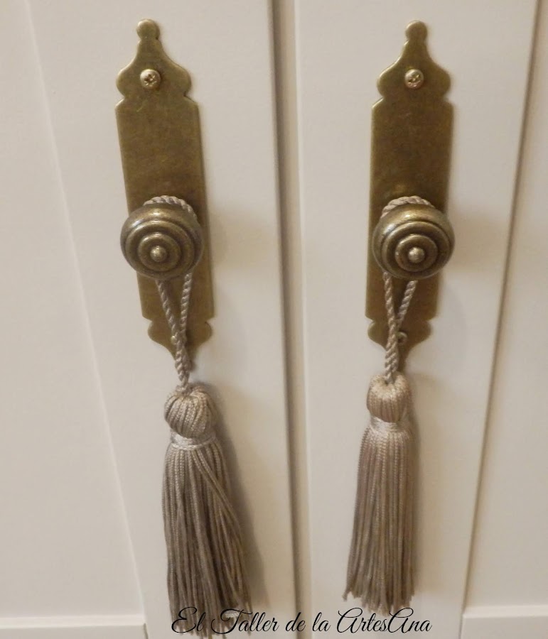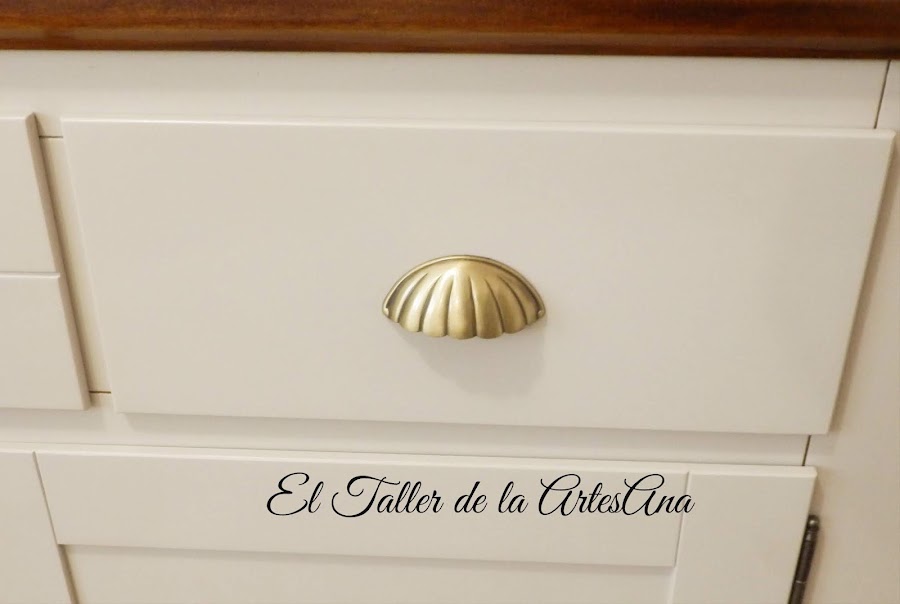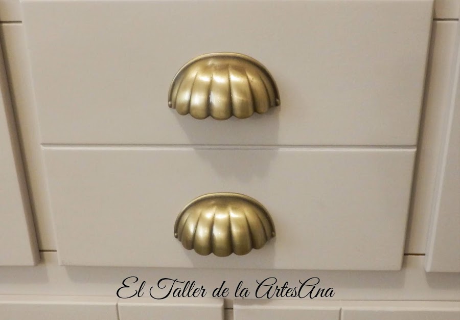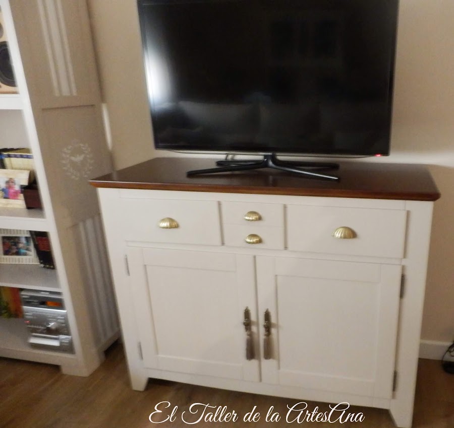 Ahora vamos con el aparador. A este decidimos dejarle el sobre en su madera natural, eso si, dándole un tinte color nogal que quedaba mucho mejor. Bien protegido con barniz ya que son muebles que tienen mucho trote. La parte inferior de nuevo el precioso Arena tostada de Mary Paint y cambio de tiradores y voilá!!! Mueble de TV nuevo. Parece otro!!!