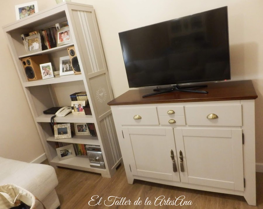 Hoy os quiero mostrar el cambio que le hicimos a una estantería que buscamos por encargo y a un aparador que nuestra clienta ya tenía en la entrada de su casa pero que ahora quería utilizarlo como mueble para la televisión. Estos dos muebles iban a ir juntos en la zona de estar de su salón por lo que decidimos darles el mismo acabado en cuanto al color se refiere. El color elegido fue el arena tostada, como de Mary Paint, ya que no queríamos volver a recurrir al blanco antiguo como en el resto de los muebles del comedor. Este es un color neutro que queda genial con cualquier otro color y con el suelo y el color de pared que tenía nuestra clienta. Así eran antes.