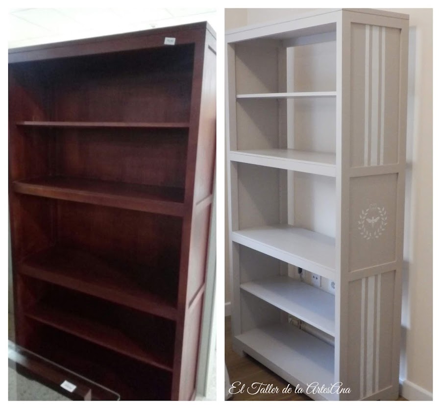 A la estantería le quitamos la trasera ya que la clienta quería que fuera más ligera y que se viera la pared para que no pesara visualmente demasiado. Una vez pintada, en los laterales con plantillas hicimos en blanco un stencil que me encanta como queda. Y así quedó la estantería...
