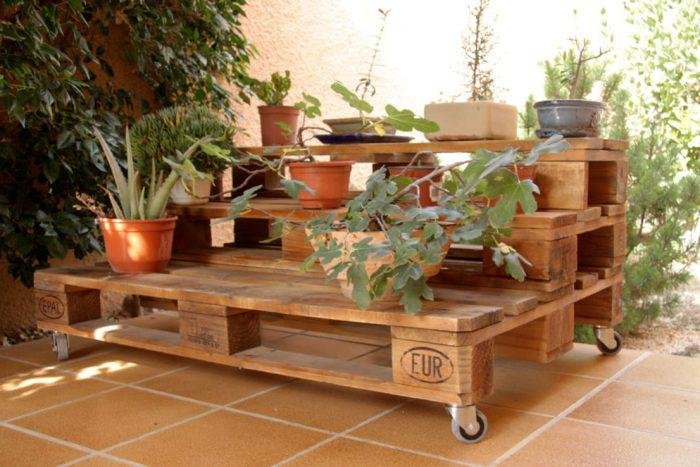 Si tenemos una terraza lo suficientemente amplia, podemos optar por esta posibilidad, que es apilar los palets en forma de escalera. Para ello, emplearemos un palet como base (será mejor ponerle ruedas si queremos que sea más fácil desplazarlo) y después pondremos encima un segundo palet, pero esta vez partido por la mitad. Por último, terminaremos poniendo sobre este último un tercio de palet, que podemos sacar del mismo que el anterior. Con esta composición conseguiremos bases para nuestras plantas, y huecos intermedios para almacenar las herramientas de jardinería, por ejemplo.