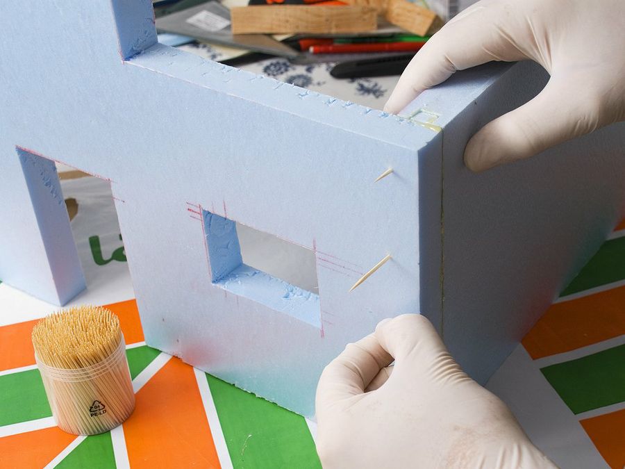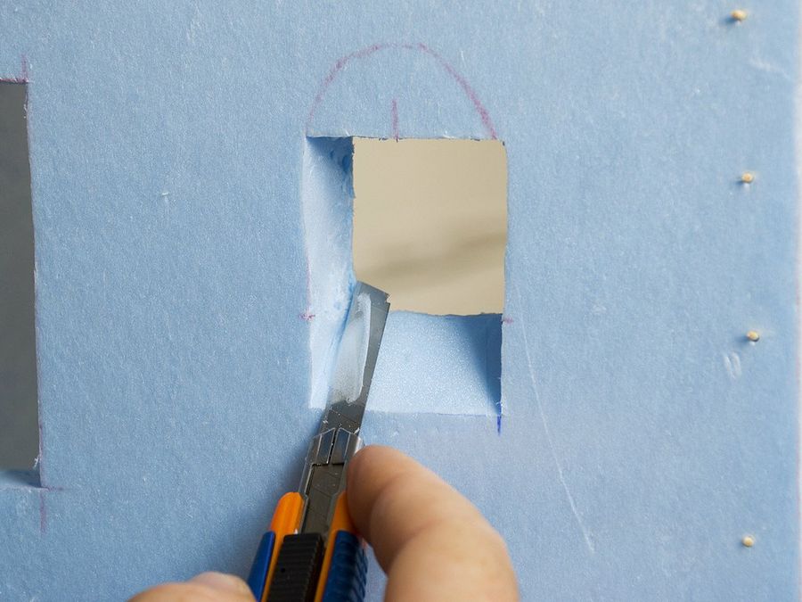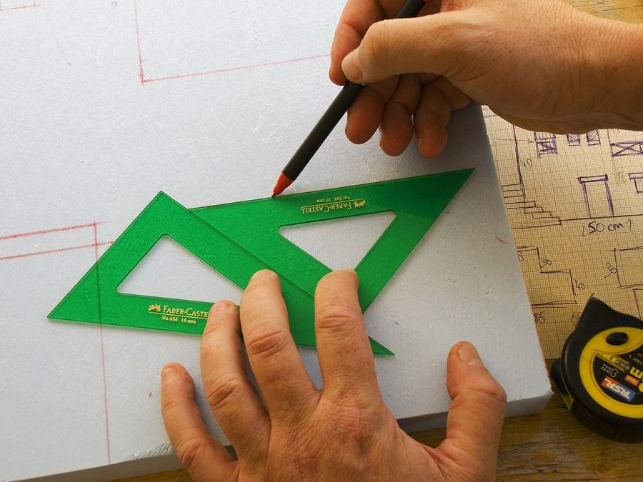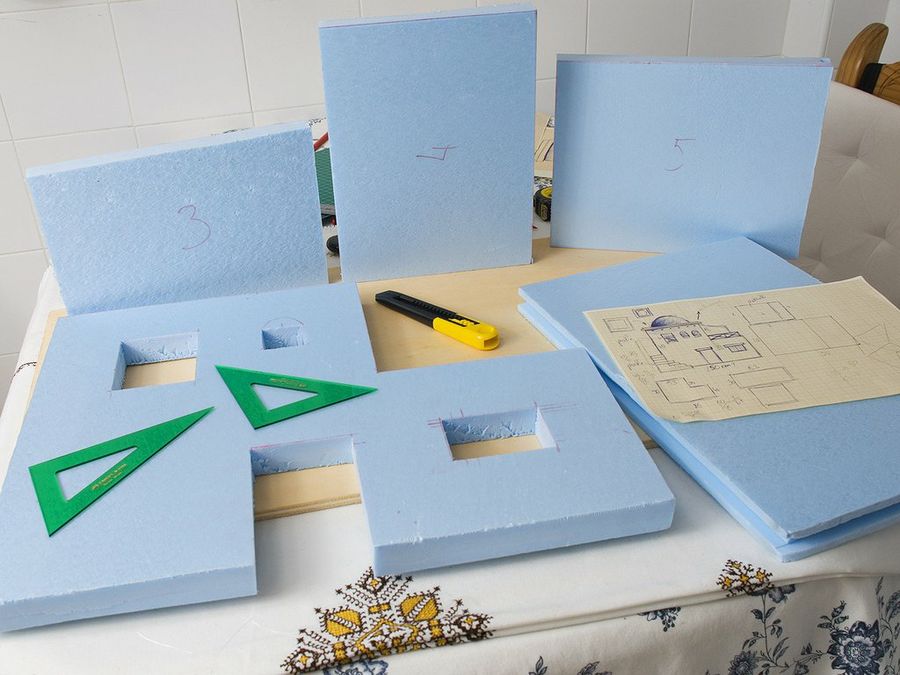 El poliuretano extruido se emplea como aislante de muros y tabiques, y se vende en los almacenes de construcción en planchas de unos 0,6 por 1,40 metros, con variados grosores. Hemos escogido el panel de 3 cm, idóneo para una casita que tendrá medio metro de fachada. Cada pieza cuesta alrededor de 5 euros, y con una sola podemos fabricar varias viviendas del pueblecito, o el castillo de Herodes. Con ayuda de la escuadra y el cartabón trazamos las ventanas y puertas.