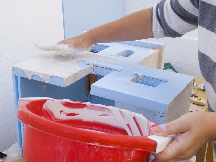 Y abordamos el revestimiento con escayola, etapa algo delicada por la rapidez del fraguado. Haremos de una sentada cada lado de la casa, trabajando con decisión. Una vez disuelta en agua la escayola, la vertemos con cuidado y alisamos la capa con las manos. Cuando haya secado, lijaremos los surcos y relieves abruptos. Por muy bien que lo hagamos, a esa escala será evidente el trabajo manual, que da encanto y verosimilitud a las humildes casas de Belén.