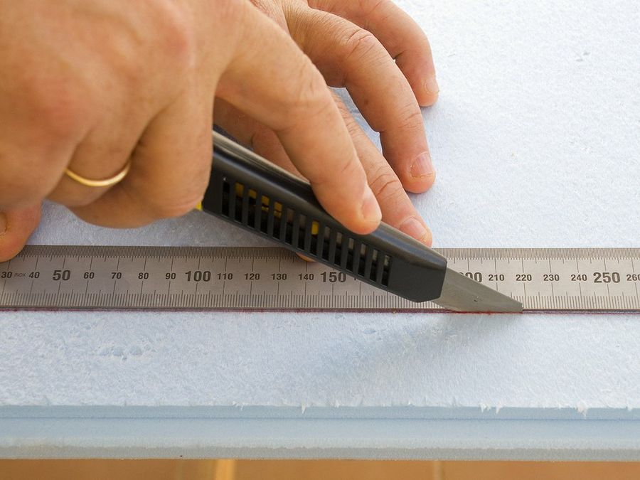 La regla de metal es compañera imprescindible del cúter. Trabajaremos la plancha de 3 cm con un movimiento parecido al de cortar pan.