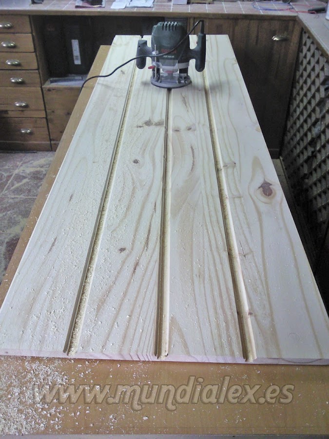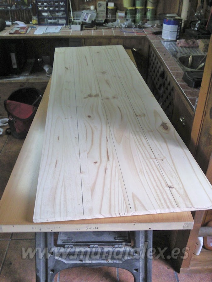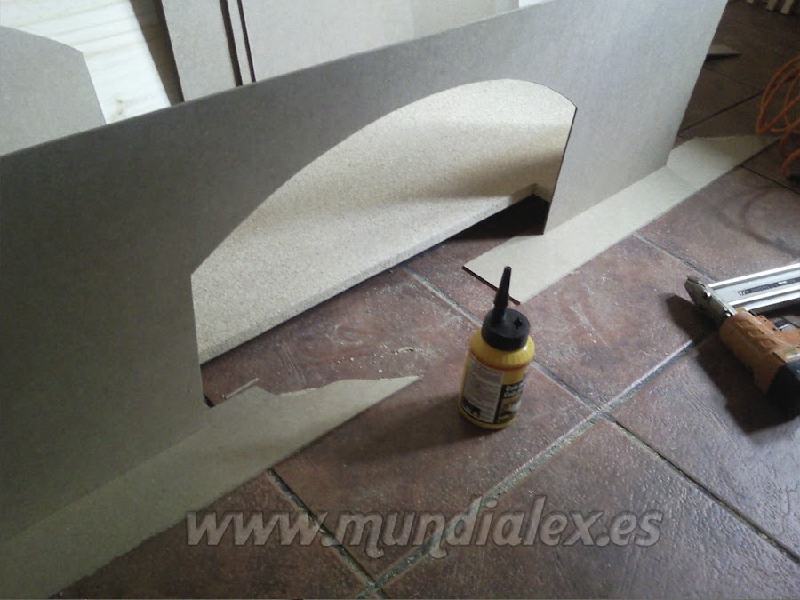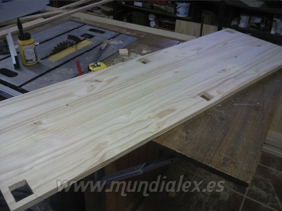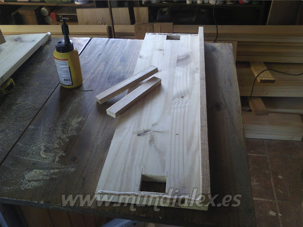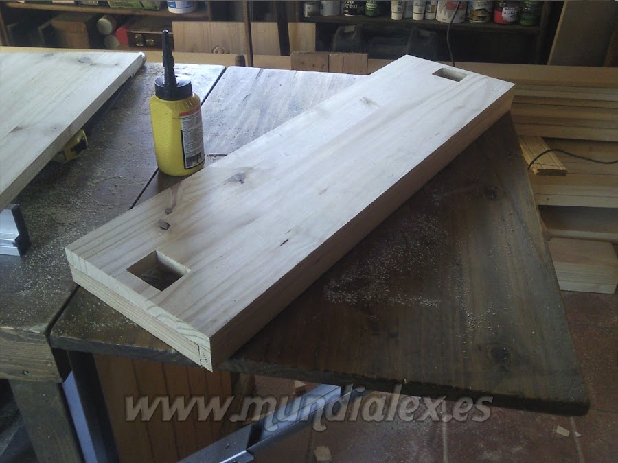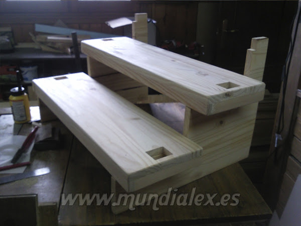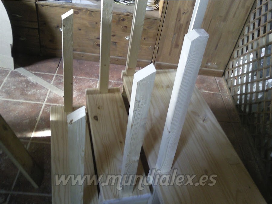 Para dotarla de gran solidez, realicé agujeros en los peldaños y en la plataforma, para pasar por ellos los listones que servirán de patas y barandilla, formando un solo cuerpo.