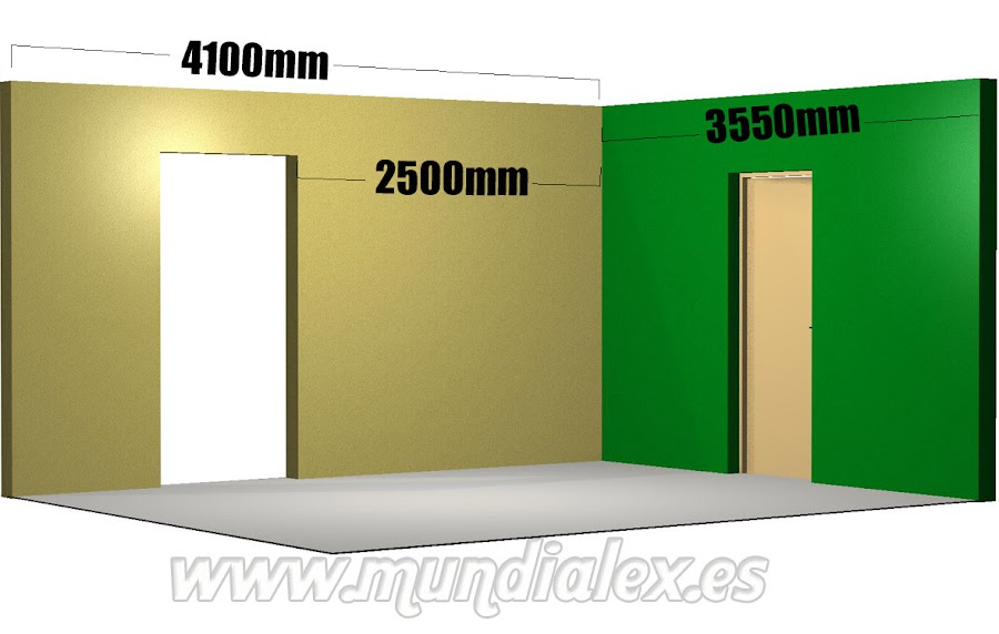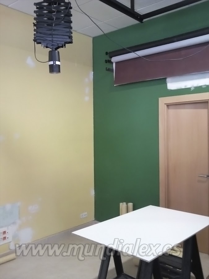 La pared de color verde tiene en el medio la puerta de entrada a los aseos, y en la amarilla hay una apertura de paso al laboratorio fotográfico.