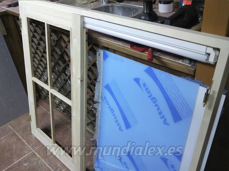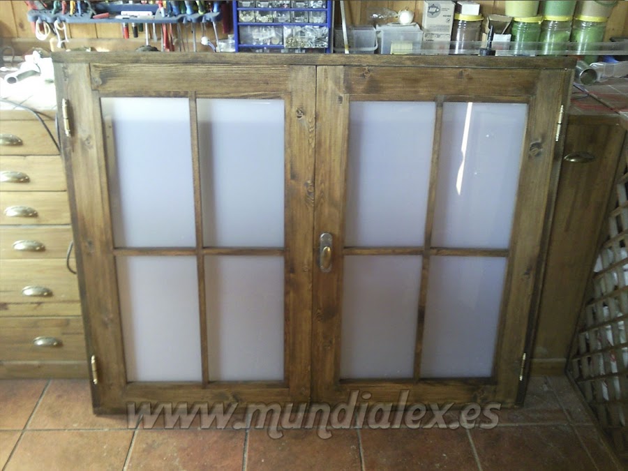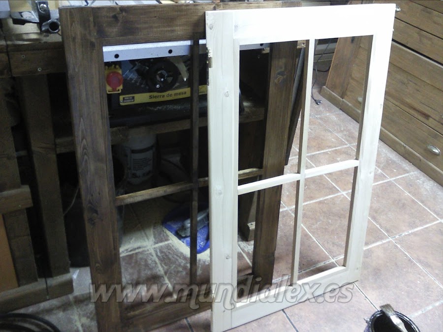 Después las ventanas, una simple y otra de doble hoja. Realizadas en madera de pino, con sus bisagras, manilla, cierres magnéticos y cristales en metacrilato hielo de 3mm.
