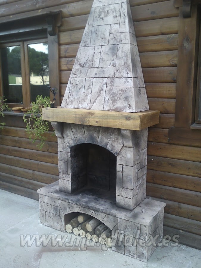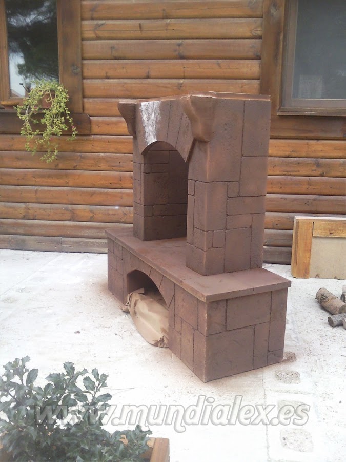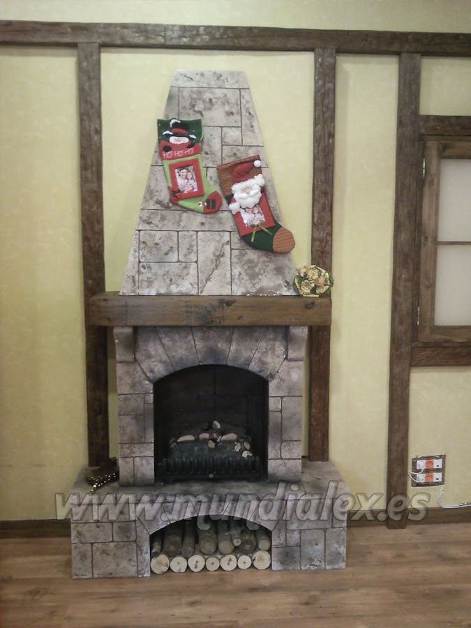 El revestimiento de la chimenea es de poliestireno extruido tallado en forma de piedras, para ello podemos servirnos de un estañador.